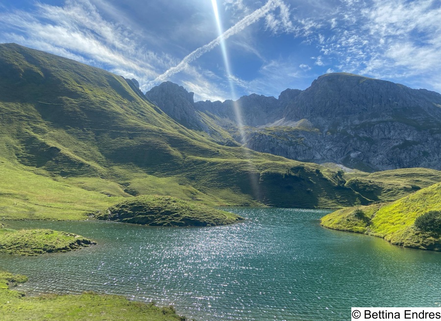 Ein Urlaubsbild am Schrecksee. In den Wolken ein Kreuz, das den See zu berühren scheint. Wir feiern das Fest Kreuzerhöhung, das seinen Ursprung in der Einweihung der Grabeskirche in Jerusalem hat. Das Kreuz bringt die christliche Botschaft auf den Punkt: Jesus, der für uns gestorben und auferstanden ist. Wir haben es in unseren Häusern, auf den Fluren, viele tragen es mit einer kleinen Kette um den Hals. Mit Jesus wissen wir uns verbunden. Gerade in schwierigen Augenblicken, gerade in den „Schreckmomente“ unseres Lebens, wenn es in unserem Herzen dunkel ist. Wir dürfen darauf vertrauen, dass er uns berührt wie auf dem Bild der Strahl des Kreuzes den See. ER ist bei uns. Seine Liebe trägt. Sie öffnet den Himmel, gibt uns eine Perspektive, gibt uns Hoffnung. Sie ist Quelle des Lebens für uns.